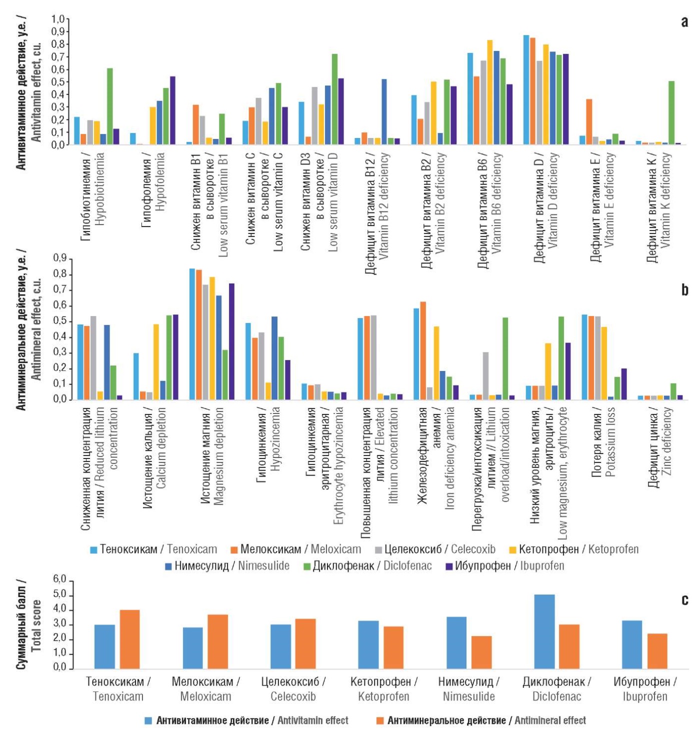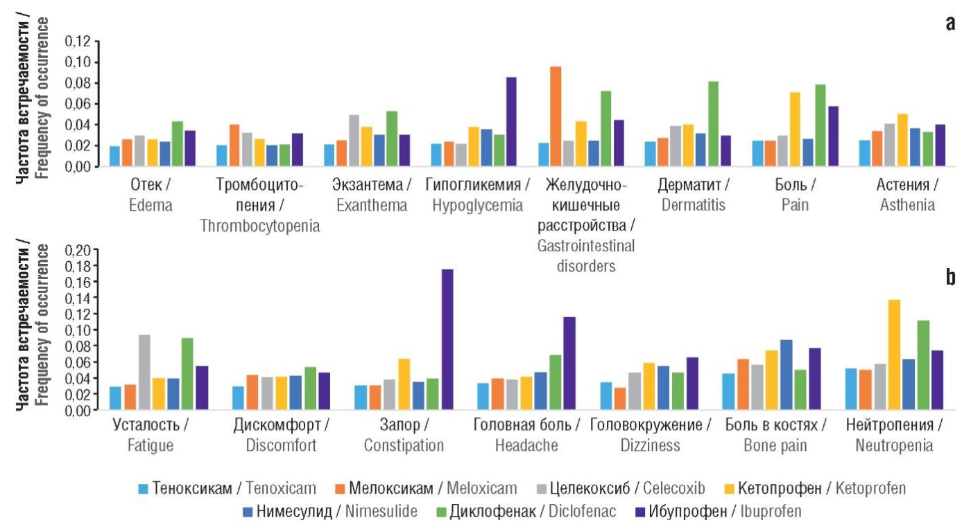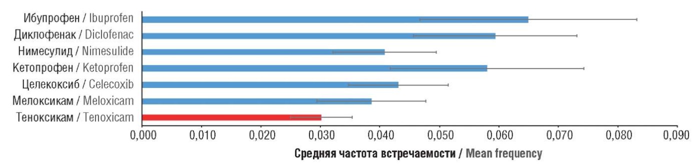 Результаты. Получены in silico оценки противовоспалительных и противоболевых эффектов теноксикама и молекул сравнения. Проанализированы профили принадлежности к различным группам анатомо-терапевтическо-химической классификации и профили частот побочных эффектов НПВП (включая воздействие на микронутриентный обмен – потери витаминов и микроэлементов). Проведено сравнение действия молекул при пероральном, топическом и парентеральном введении. Профиль фармакологических эффектов теноксикама существенно отличался от таковых у других НПВП, указывая, в частности, на потенциальные антитромботические, гипогликемические, антигистаминные свойства. Теноксикам, в отличие от других молекул, может существенно влиять на синтез, секрецию и активность лейкотриена В4 и проявлять ингибирующее действие на рецепторы кининов. Теноксикам не стимулирует более сильные потери микронутриентов, чем другие НПВП. Хемореактомные оценки центральных эффектов показали, что теноксикам проявляет их сопоставимо с другими НПВП. Противовоспалительное действие теноксикама при топическом, пероральном и парентеральном введении также сопоставимо с другими НПВП. По результатам анализа частот встречаемости различных побочных эффектов, усредненных по исследованной выборке, теноксикам характеризовался наименьшим показателем (3%; другие молекулы: 4–7%).