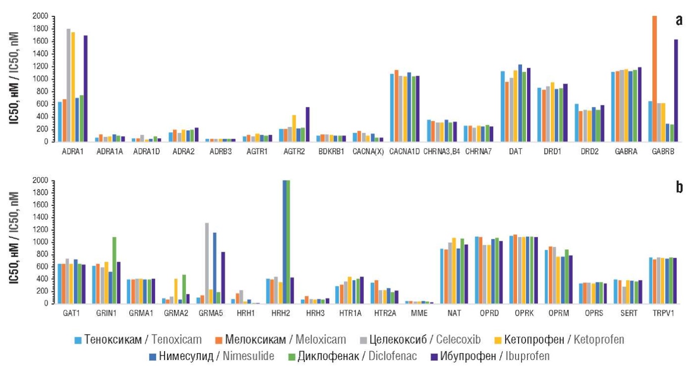 Цель: сравнение эффектов молекул теноксикама, мелоксикама, целекоксиба, кетопрофена, нимесулида, диклофенака, ибупрофена методом хемореактомного, хемопротеомного и фармакоинформационного анализа.