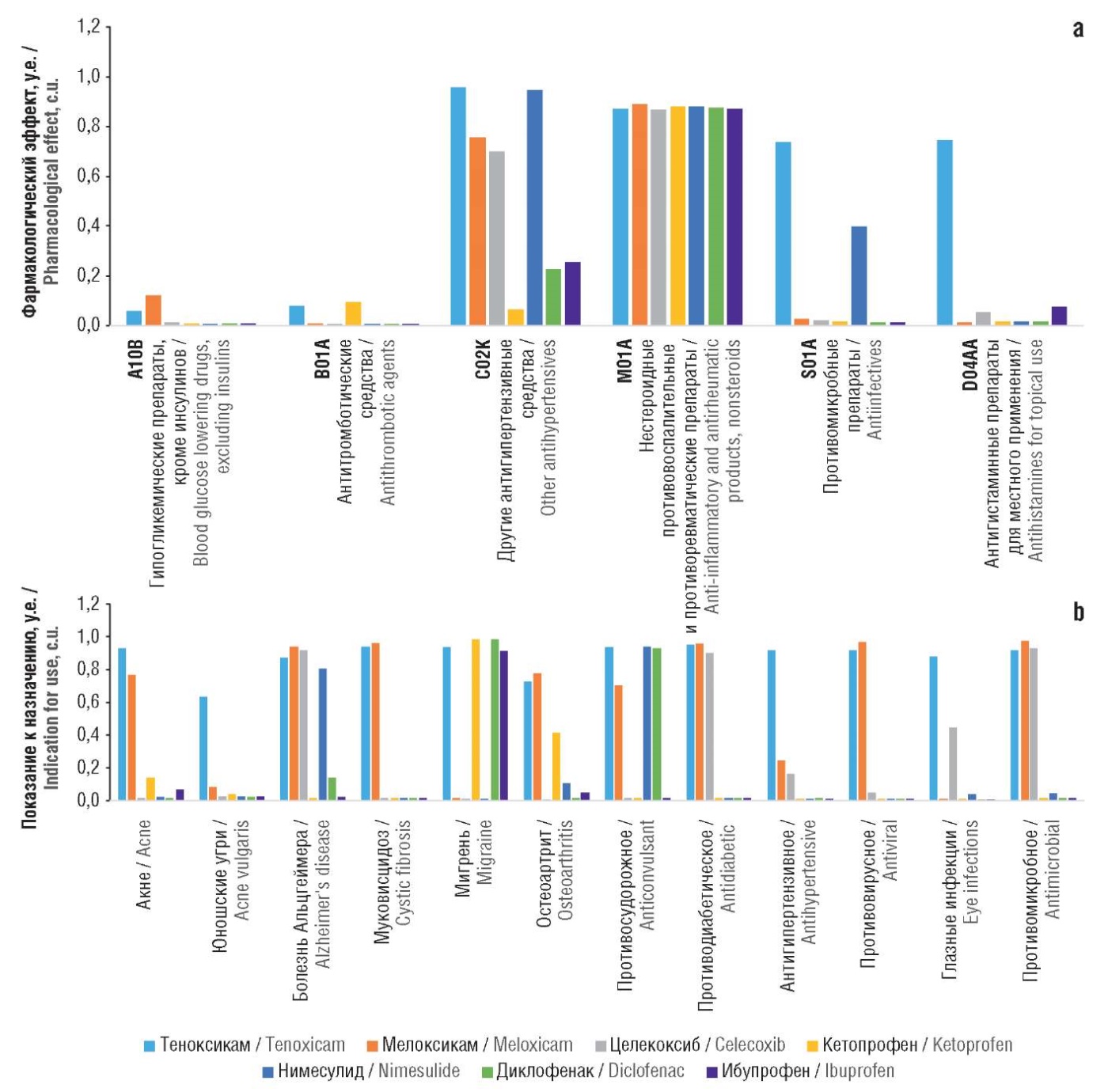 Поэтому возникает необходимость применения новых методов оценки фармакологических и других свойств молекул действующих начал НПВП [8], разрабатываемых в научной школе академиков РАН Ю.И. Журавлёва и К.В. Рудакова по направлению «хемореактомный анализ» [9–11]. Такие алгоритмы производят унифицированные спектры фармакологических свойств различных молекул, которые могут непосредственно сравниваться друг с другом [12], и позволяют делать выводы о молекулярных механизмах препаратов [13], оценивать эффекты на уровне организма пациента (фармакоинформационный анализ), получать диапазон всех вероятных применений лекарства (классы анатомо-терапевтическо-химической классификации (АТХ)), прогнозировать частоты встречаемости нежелательных эффектов.