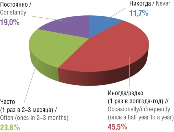 На основе полученных результатов можно сделать вывод, что 1 раз в 2–3 месяца самостоятельно лечится каждый четвертый респондент (23,8%), 1 раз в полгода – почти каждый второй опрошенный (45,5%), а каждый пятый делает это постоянно (19,0%). Наиболее часто проводят самолечение женщины и более молодые респонденты, однако корреляция слабая (p=0,001; rs<0,3). Распределение ответов респондентов представлено на рисунке 1.
