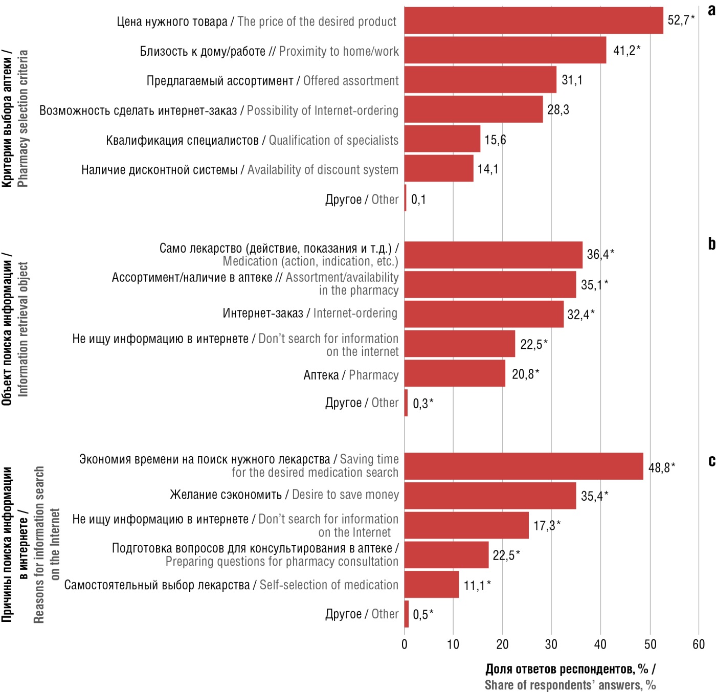 а – рharmacy selection criteria; b – information retrieval object; с – reasons for information search on the Internet.