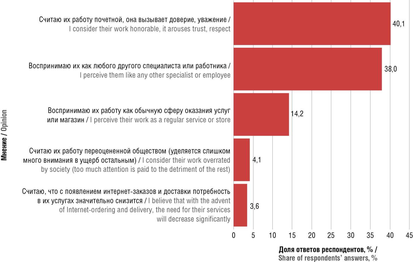 В целом у респондентов преобладает позитивное или нейтральное отношение к фармацевтическим работникам, что коррелирует с более низкой частотой самолечения. Значительная доля ответов о том, что фармацевтическая помощь сопоставима с обычной сферой услуг или магазином, может быть обусловлена неосведомленностью респондентов об обязательности соответствующего образования у сотрудника аптеки. Указание на переоцененность работников аптек и снижение потребности в таких специалистах можно назвать достаточно субъективной оценкой, особенно в условиях кадрового дефицита в данной профессии.