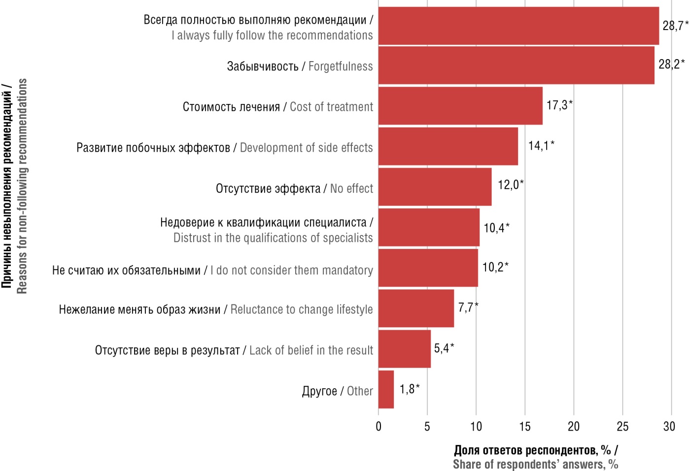 Основными причинами называли забывчивость, стоимость терапии, а также развитие побочных эффектов. При этом 20,6% респондентов указывали на недоверие к квалификации специалистов и/или не считали их рекомендации обязательными. Все отмеченные факторы (кроме забывчивости и мнения о необязательности рекомендаций) имели достоверную корреляцию с самолечением (p≤0,007; rs<0,3 – слабая). Нежелание менять образ жизни, а также отсутствие веры в результат коррелировали с мужским полом и более молодым возрастом (p≤0,039; rs<0,3 – слабая). Молодые чаще выбирают забывчивость, а более старшие чаще всегда выполняют рекомендации или отмечают развитие побочных эффектов (p≤0,044; rs<0,3 – слабая).