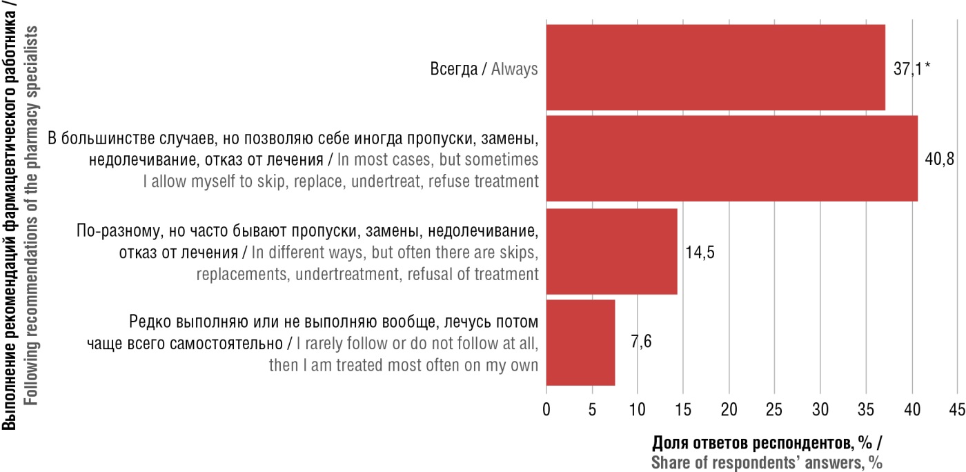 По результатам анализа ответов о следовании рекомендациям аптечного работника можно заключить, что чем точнее выполняются рекомендации фармацевтического специалиста, тем меньше у респондентов склонность к самостоятельному лечению. Значимыми факторами/причинами невыполнения рекомендаций являются сознательные причины (неверие в результат, нежелание менять образ жизни, недоверие к квалификации специалиста, мнение о необязательности рекомендаций). Соответственно, есть возможность коррекции данных факторов комплаенса, в т.ч. с помощью полноценного фармацевтического консультирования.