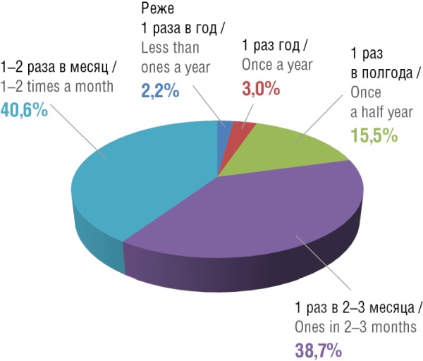 Основным инструментом самолечения должны быть лекарственные препараты и другие товары фармацевтического ассортимента, поэтому в следующем блоке вопросов мы уточнили у респондентов частоту посещения ими аптечных организаций. Распределение ответов показано на рисунке 2.