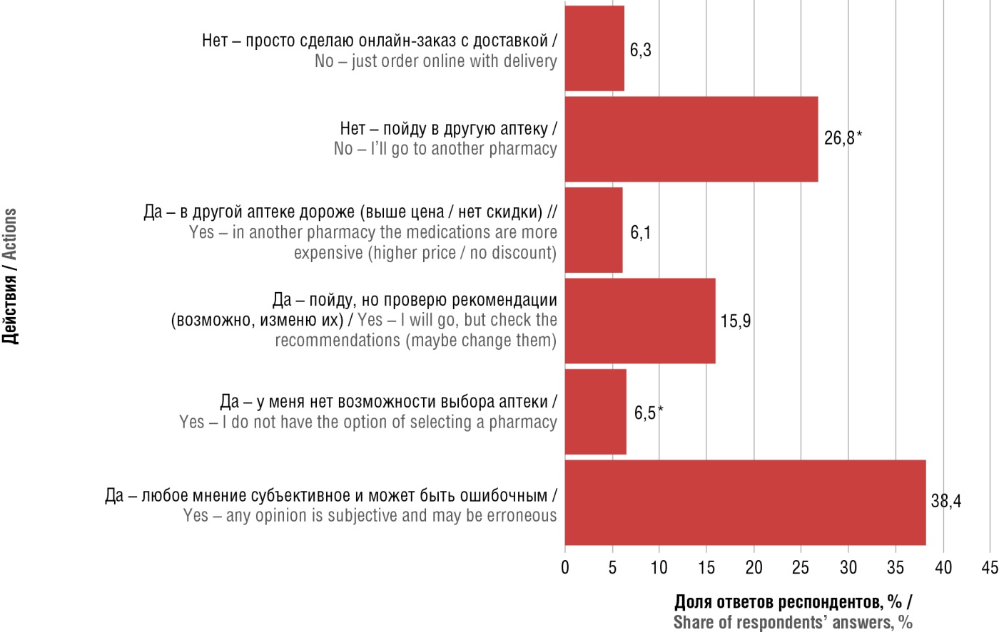 Возможность ошибки или субъективности чужого мнения отметили 38,4% опрошенных. Только 6,1% назвали приоритет цены, а 6,5% не имеют возможности выбора аптеки. Отсутствие выбора аптечных организаций коррелировала с низкой частотой самолечения, а отказ от посещения и выбор другой аптеки – с высокой (p≤0,039; rs<0,3 – слабая). При этом решение о посещении аптеки вопреки чужому мнению чаще принимают мужчины, а о выборе другой аптеки – женщины и более старшие респонденты (p≤0,026; rs<0,3 – слабая). Участники более молодого возраста пойдут в аптеку даже при наличии негативной информации в связи с отсутствием возможности выбора, низкой ценой, а также предпочтут в этом случае проверить рекомендации или изменить их (p≤0,017; rs<0,3 – слабая).