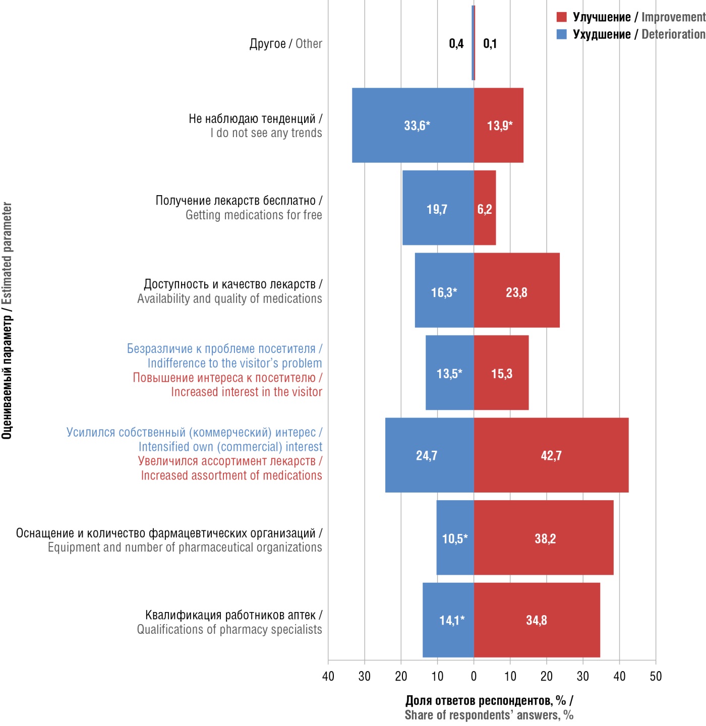 Среди позитивных тенденций наиболее часто отмечали увеличение ассортимента лекарств, улучшение оснащения и количества фармацевтических организаций и повышение квалификации работников аптек. С высокой частотой самолечения коррелировал только ответ «не наблюдаю позитивных тенденций» (p≤0,044; rs<0,3 – слабая). Женщины чаще указывали на увеличение ассортимента, качества и доступности лекарственных средств (p≤0,022; rs<0,3 – слабая), мужчины и более молодые респонденты – на расширение возможностей получения лекарств бесплатно и повышение квалификации работников (p≤0,035; rs<0,3 – слабая), а также более молодые отметили повышение интереса к отдельному посетителю со стороны специалиста (p≤0,017; rs<0,3 – слабая).