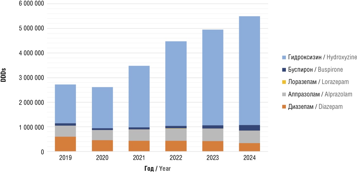 Цель – оценить структуру и объемы потребления ЛС группы анксиолитиков в РФ в период 2019–2024 гг.