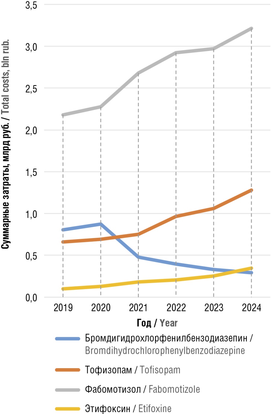 В период 2019–2024 гг. в РФ отмечен рост потребления анксиолитиков, прежде всего за счет увеличения розничных продаж гидроксизина и буспирона. Продажи БЗД сократились почти вдвое. Среди анксиолитиков, для которых не установлены DDDs, ведущим по затратам на приобретение в розничной сети был фабомотизол, продажи бромдигидрохлорфенилбензодиазепина снизились почти в 3 раза.