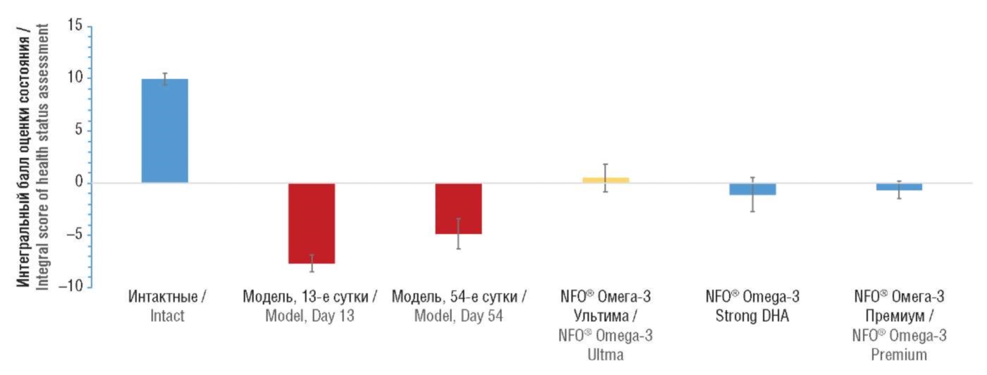 Таким образом, интегральный балл, включая результаты по всем исследованным показателям, позволяет оценивать общее состояние животных после проведения той или иной терапии и указывает на выраженный терапевтический эффект стандартизированных ω3-ПНЖК.